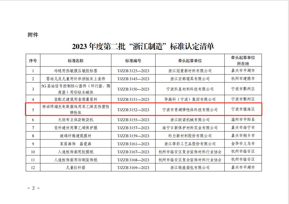 寧波市青湖彈性體科技有限公司牽頭起草的《移動(dòng)終端充電數(shù)據(jù)線用苯乙烯類(lèi)熱塑性彈性體》T/ZZB 3152—2023浙江制造團(tuán)體標(biāo)準(zhǔn)名列其中。